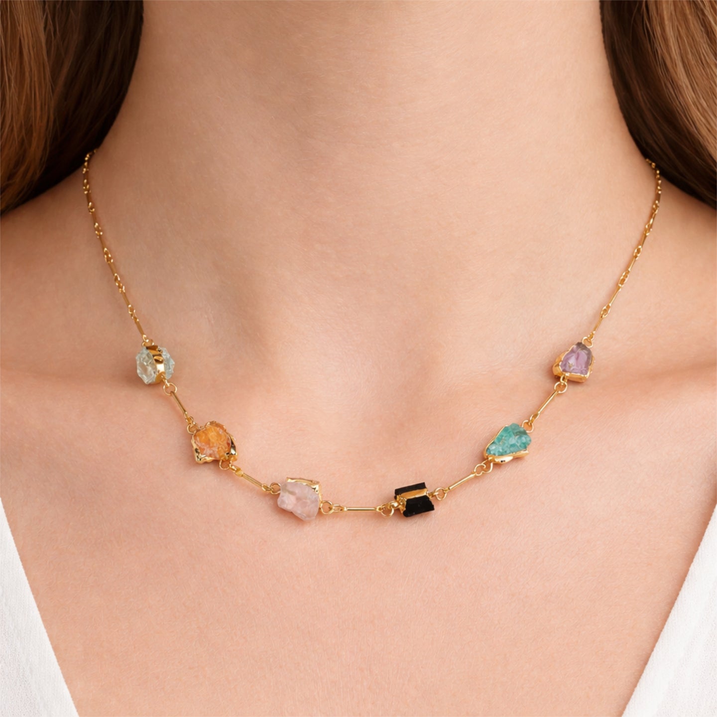 Ein Collier aus Natursteinen ist nicht nur ein Schmuckstück, sondern vereint auch die Faszination der natürlichen Elemente mit hochwertigem Handwerk. Besonders das Collier, das aus sieben verschiedenen Natursteinen besteht – darunter Amethyst, Kristallquarz, Blauer Kyanit, Rosenquarz, Citrin und Schwarzer Turmalin – und mit 18 Karat vergoldet ist, spiegelt diese Verbindung von Natur und Luxus wider.